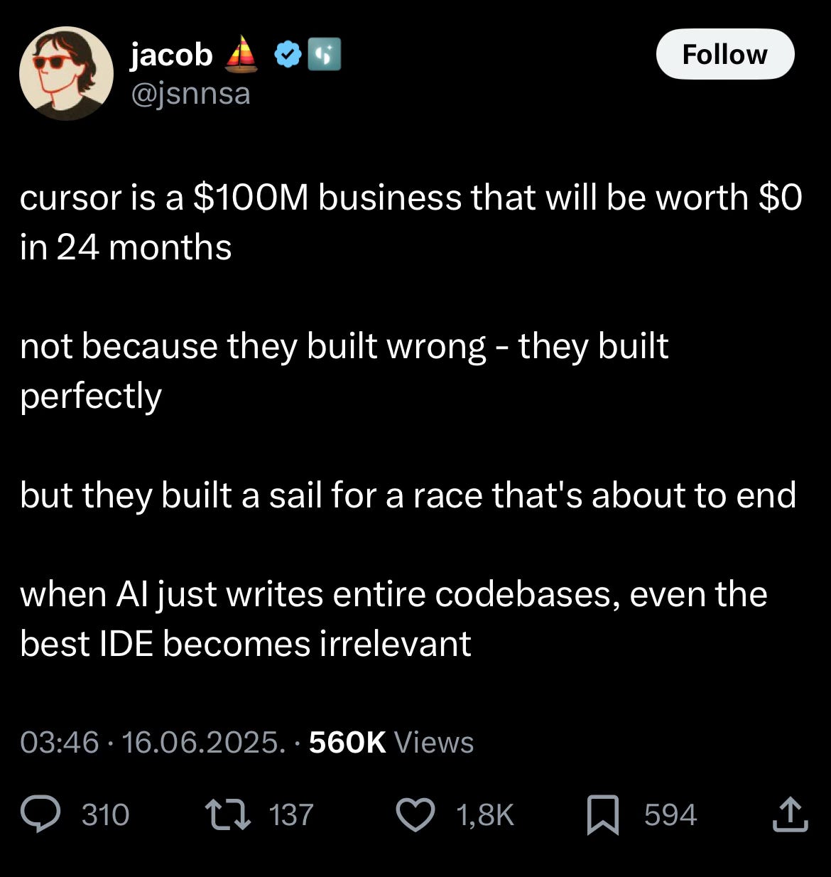 Jacob argues the $100M IDE business built a perfect sail for a race that's about to end when AI writes entire codebases.
